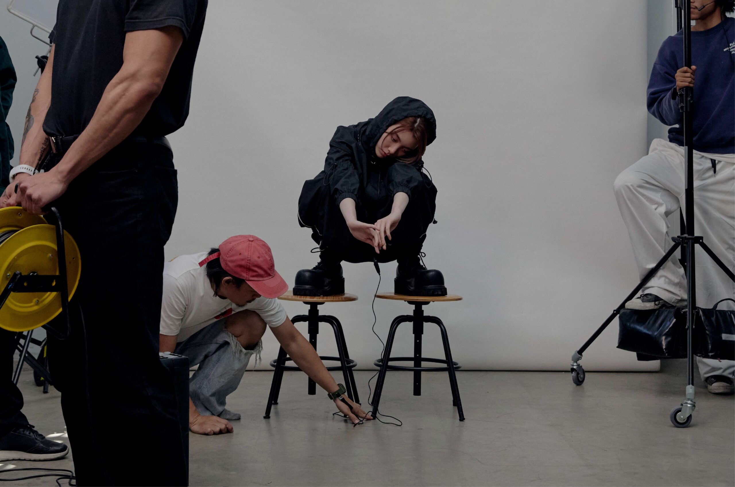 今回公開されたビジュアルでは、撮影スタジオでの舞台裏の様子が切り取られており、無機質な空間の中で存在感を放つOrmの姿が印象的です。黒を基調としたスタイリングでは、ラフさとモード感が絶妙に融合し、これまでとは一味違うクールな魅力を見せています。